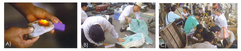 a) A buyer examines a jade stone found near a Hpakant mine in Kachin state b) Customers examine jade at the Gems Emporium in Naypyidaw