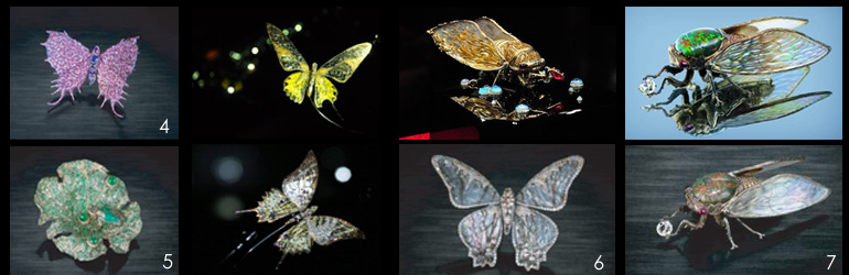 4. Unfettered: Pink sapphire, diamond, 18k white gold and titanium. Image © GIA. 5. Pleasure: Emerald, green garnet, jadeite, diamond, coloured diamonds, alexandrite cat's eye, 18k white gold and titanium. Image © GIA. 6. Moon Fairy: Coloured diamonds, mother of pearl, rock crystal quartz, 18k white gold and titanium. Image © GIA. , 7. Zen: Black opal, coloured diamonds, diamond, ruby, mother of pearl, rock crystal quartz, 18k yellow gold and titanium. Image © GIA. |