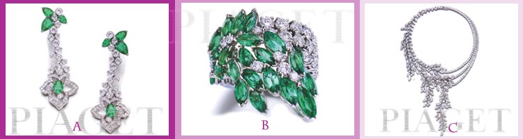 A.Piaget's 18K white gold earrings set with 114 brilliant-cut diamonds, 2 oval-cut emeralds. & 6 pear-shaped emeralds B. Piaget's 18K white gold ring set with 32 brilliant-cut diamonds & 25 marquise-cut emerald C. Piaget's 18K white gold necklace set with 468 brilliant-cut diamonds & 40 marquise-cut diamonds |