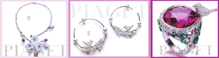 spring-like elegance of a garden party. Chalcedony cherry blossoms bloom spontaneously on diamond and pearl studded branches, playfully waving with mischievous charm, and a voluptuous ring wind itself around fingers like climbing emerald ivy. © Piaget 2010. All rights reserved; |
