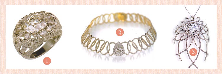 | 1.Faberge' - Eventail ring - an elegant Bombe shapped openwork ring, in the Carnet de Bal collection of Farberge' contemporary diamond classics © Faberge' Limited 2.Faberge' - Soleil de Nuit necklace - this necklace, a masterpiece of modern Faberge', is centred on a magnificent pear-shaped white Golconda diamond of 13.21 carats, its outline mirrored in the interlinked openwork diamond shapes, alternately inverted, that unfold, like a corp de ballet, around the deep collar. © Faberge' Limited 3.Faberge' - Trelliage pendant - part of the Trelliage series in the Carnet de Bal diamond collection © Faberge' Limited |