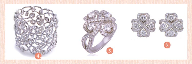 | 4.Faberge' - Mazuka bangle - a wide openwork cuff designed as a light and lively, asymmetric comparison of entwined diamond ribbons © Faberge' Limited 5.Faberge' - Quadrille ring - a distinctive Faberge' contemporary classic, the quadrille ring can be worn as part of a matching set with earrings & pendant , or with other jewels in the Carnet de Bal diamond collection © Faberge' Limited 6.Faberge' - Quadrille earrings - dancing ribbons of diamonds are looped around four single round diamonds, their shape hinting at the taltismanic four-leaf clover, a signature Faberge' theme . © Faberge' Limited |
