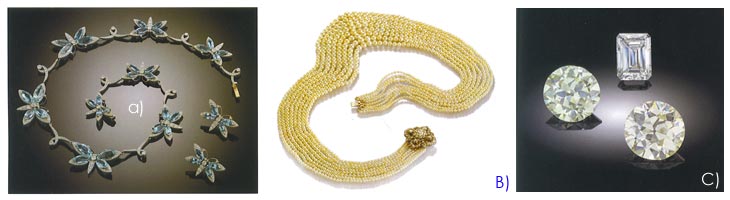 a) From Christie's Dubai auction of Jewels and Watches - an aquamarine & diamond necklace, made in the the 1970s designed as a string of graduated butterflies, their wings picked out in aquamarine. Sold with a pair of matching earrings. Estimate: US$20,000-30,000 b) An 8-strand graduated natural pearl necklace with an antique diamond clasp. Estimate: US$240,000-80,000 c) Three spectacular rings: An 11.63 cts brilliant-cut stone. Estimate:US$70,000-90,000; A 10.13 cts stone. Estimate: US$40,000-60,000; A 5.68 ct F colour, VVS2 clarity rectangular diamond. Estimate:US$90,000-120,000 |