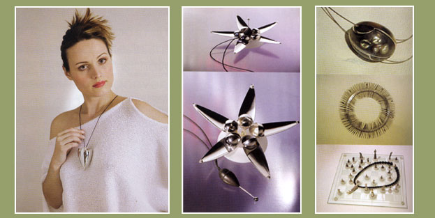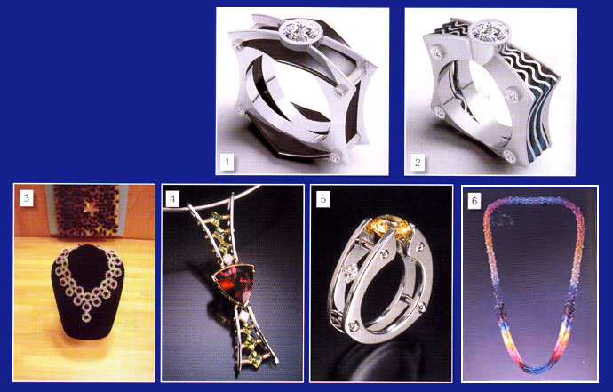 and the design's perceived manufacturing and marketing potential. This year saw the addition of four new distinction categories-Silver Distinction, sponsored -- by The Silver Users Association; Mokume-gane Distinction, sponsored by Reactive Metals Studio and Shining Wave Metals; Reactive Metals Distinction, sponsored by Reactive Metals Studio, Cabot Supermetals, and Titanium Products Design Inc.; and CAD/CAM Distinction, sponsored by Model Master. Other distinction categories, in addition to the overall Professional and Student awards, include Platinum Distinction, sponsored by Platinum Guild International USA, and Crystal Distinction, sponsored by Swarovski North America. |