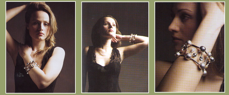 Technical Prize ex aequo, awarded with 1 '000 Swiss francs Creation by Remo Huppi Bolli Goldschmied in St.Gallen, Schule fur Gestaltung St.Gallen This is a reproduction of serotonin, the hormone of happiness. Keshi pearls represent the hydrogen atoms, silver balls of various surfaces the other atoms of the substance. They are connected by carbon fibre sticks. Thanks to an amazing combination of complicated movements, notches and click joints built into the silver balls, the setup can be laid out to represent the hormone, or folded to turn into a solid and lightweight bangle with an expressive, feminine character. Showcased as a hormone or worn as a piece of jewellery, it's always the serotonin that provides the talisman's magic power. Conceptual Prize, awarded with 2'000 Swiss francs Creation by Ueli Rogger l Goldschmied Lux in St.Gallen, Schule fur Gestaltung St.Gallen The pearls featured on those T-shirts represent stellar constellations. Orion, symbol of life and power,is placed on the upper arm, Taurus, symbol of light and love on the heart, Virgo, symbol of fertility and harvest, on the stomach, and Aquila, the eagle, on the back, to proier. from dangers coming from behind. Detachable and interchangeable, the keshi pearls are mounted on snaps. Wef exposed on the tissue, they can also be attached uncte-neath, to transmit their magical power in direct contact wit the skin |