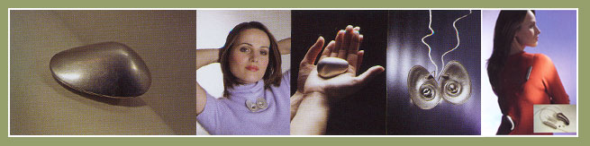 Grand Prize, awarded with 4'000 Swiss francs Creation by Christof Kaderli Bijoux Stadelmann in Bern, Schule fur Gestaltung Bern Round and flat, this talisman slides into any pocket or purse, to accompany its mistress everywhere. Combined with a silk scarf, it becomes a pendent. Fingertips love to caress the hollow shapes carved into the dark wood. They can use the grip to turn the two sides in opposite directions, so white rays swing out to show the pearls. The mechanism and shapes are so smooth that it's a pleasure to activate the movement again and again, while the visual variety and lustre of the keshi pearls amplify the intimate communication with the talisman. This is a real fetish. Worn as a pendent, it can be shown discretely or predominantly, or hidden, as it adapts to any mood and clothing. Technical Prize ex aequo, awarded with 1'000 Swiss francs Creation by Sabine Verzasconi Ecole d'art des Montagnes neuchtteloises in La Chaux-de-Fonds This is an original necklace that hides its treasure? inside. Placed upside down on a discrete stand, the pe> dent opens like a flower. Its heart, permanently attache: to the string, is a pendulum. The foot of each leaf of th flower is a spherical chamber containing a keshi pearl whose lustre is beautifully reflected in the fully polish surface. The pearls move freely in their open showcase and all the parts reassemble to become the pendent again firmly secured without need to activate any locking system Minute magnets hold the leaves closed. |