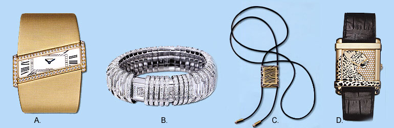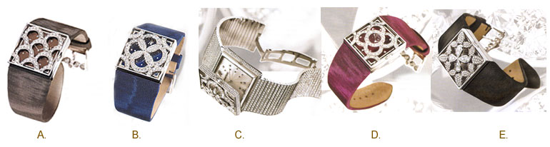 diamonds (1.55 carats) , diamond-pave dial, black technological satin strap. B) 18-carat yellow gold case set with 58 brilliant-cut diamonds (1.55 carats) mother -of-pearl dial, chocolate brown technological satin strap. C) 18-carat white gold case set with 32 black baguette-cut sapphires (3.20 carats), engraved mother-of-pearl dial, black technogical satin strap. D) Case and bracelet in 18-carat white gold entirely set with 192 baguette-cut diamonds (25.15 carats). |