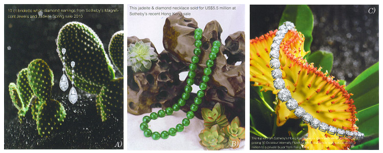 | A) 10ct briolette white diamond earrings from Sotheby's Magnificent Jewels and Jadeite Spring sale 2010 B) This jadeite & diamond necklace sold for US$ 5.5 million at Sotheby's recent Hong Kong sale C) The top lot from Sotheby's Hong Kong sales a diamond rivere necklace comprising 50 D-colour Internally Flawless white diamonds was sold at US$6.7 million to a private buyer from Hong Kong. |