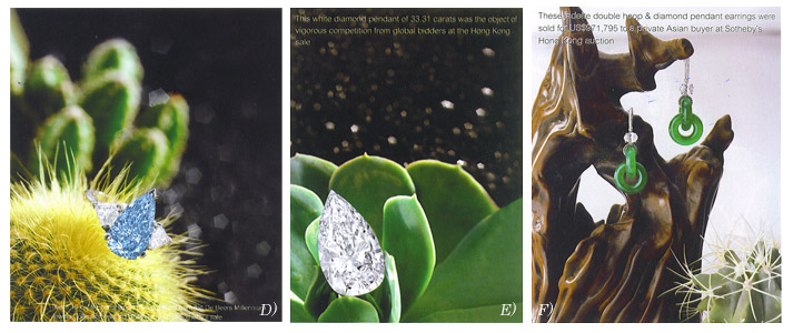 | D) This 5.16 carat pear shaped blue diamond from the De Beers Milliennium jewels Collector related US$6.4 million at Sotheby's sale. E) This white diamond pendant of 33.31 carats was the object of vigorous competition from global bidders at the Hong Kong sale. F) These jadeite double hoop & diamond pendant earrings were sold for US$971,795 to a private Asian buyer at Sotheby's. |