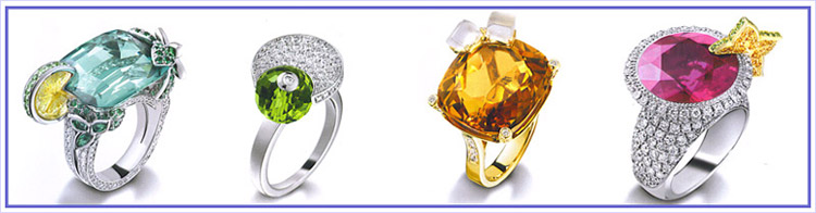 Left to right : Piaget - Mojito Inspiration - 18K white gold ring set with 182 brilliant-cut diamonds, 1 cushion-cut green tourmaline, 1 carved citrine, 16 round-cut tsavorites, 120 round-cut emeralds, 8 marquise-cut emeralds Piaget - White Tonic Inspiration - 18K white gold ring set with 44 brilliant-cut diamonds, 1 round-cut bead peridot Piaget - Whisky on the Rocks Inspiration - 18K yellow gold ring set with 100 brilliant-cut diamonds, 1 cushion-cut citrine, & 2 carved Piaget - Cosmopolian Inspiration - 18K white gold ring set with 197 brilliant-cut diamonds, 1 cushion-cut pink rubellite, & 1 carved citrine |
