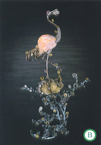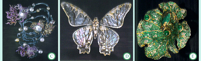 | C. From the Wallace Chan Collection - Harmony: pearl, pink sapphire, red spinel, sapphire, colored diamonds, ruby, citrine, opal, rock crystal quartz, 18K white gold & titanium. , Image © GIA D. From the Wallace Chan Collection - Moon Fairy, colored diamonds, mother of pearl, rock crystal quartz, 18K white gold & titanium. , Image © GIA E. From the Wallace Chan Collection - Pleasure: emerald, green garnet, jadeite diamond, colored diamonds, alexandrite cat's eye, 18K white gold & titanium. , Image © GIA |