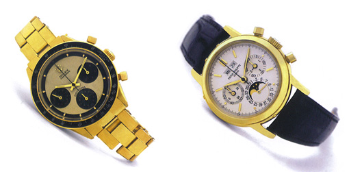 Left to right : This Patek Phillippe, Celestial, Ref. 5102G white gold automatic astronomical wristwatch with sky chart, phases & orbit of the moon & time of meridian passage of sirius & of the moon, manufactured in 2006 sold for US$218,450 at Hong Kong