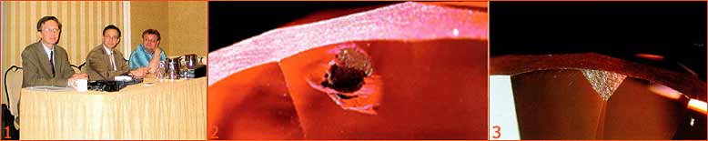 1 From left, Lucent Diamonds President Alex Grizenko, GIA's Christopher P. • Smith, and New Diamonds of Siberia's Research and Development Manager ^f Dr. Victor Vins discuss the Lucent treated-color pink-to-red diamonds at the i AGA conference in Las Vegas. (GIA Photo.) 2 A very coarsely textured graphitization of the diamond surrounding naturally occurring mineral inclusions and along associated stress fractures was commonly seen in many of the Lucent samples. The morphology of the mineral inclusions resembles that of olivine or garnet, which occur as inclusions only in natural diamonds; the metallic inclusions seen in many synthetic diamonds have a very different shape and appearance. Photomicrograph by C. P. Smith; magnified 62x. 3 Small, severely etched areas were present on or near the girdles of several samples, indicating that the damage caused by certain phases of the treatment process had not been completely removed by repolishing. Photomicrograph by C. P. Smith; magnified 50x. |