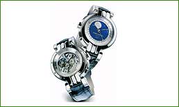 1 Harry Winston: Opus 4 CASE: in platinum, rounded shape, 180 degree rotation on sides. DIAL: see-through sapphire glass front, baton hands and Arabic numerals lacquered and hand-engraved back with large moon phases, analogic date, baton hands and Arabic numerals. MOVEMENT: self-winding with time functions on reverse dials, 53 hours of power reserve. FUNCTIONS: date and moon phases, Westminster minute-repeater (hour, quarter hour, minutes) and Tourbillon. |