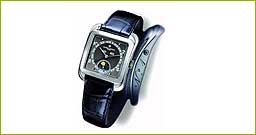 4 Vacheron Constantin: Toledo 1952 CASE: in platinum, carree galbe shape. DIAL: slate colour, baton hands, baton indexes alternating with Arabic numerals, analogical date, digital day and month, dial for small seconds and moon phases. MOVEMENT: self-winding, 40 hours of power reserve. FUNCTIONS: small seconds, date, day, month and moon phases. |