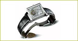 6 Jaeger-LeCoultre: Re-verso Platinum Number Two CASE: in platinum, reversible and rectangular shape, sapphire crystal back is showing the Tourbillon device. DIAL: in gold, two colour shading in silver and ruthenium, baton hands and Arabic numerals, dials for the small seconds hand and power reserve. MOVEMENT: mechanical, crafted, assembled and decorated by hand, 45 hours of power reserve. FUNCTIONS: small seconds, power reserve and Tourbillon. |