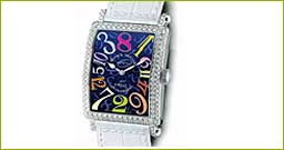 7 Franck Mulier: Long Island Crazy Color Dreams CASE: in platinum, rectangular shape, bezel decorated with diamonds. DIAL: blue, in guilloche with lacquered finish and mother-of-pearl, Stuart hands, large coloured and irregular Arabic numerals. MOVEMENT: self-winding with a "jumping" hours, rotor in platinum. FUNCTION: hours and minutes |